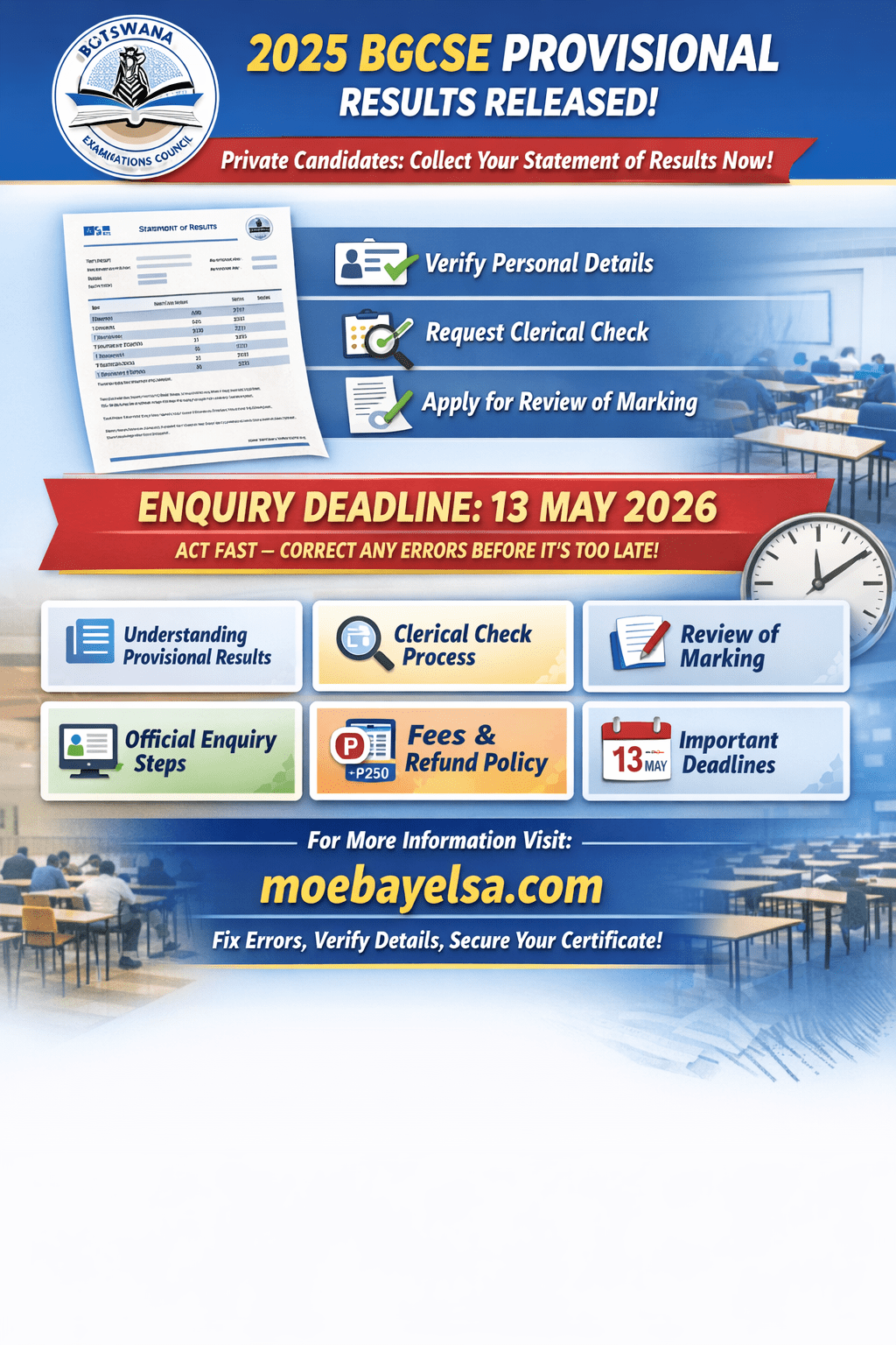 The Botswana Examinations Council has released the 2025 Botswana General Certificate of Secondary Education (BGCSE) provisional results. If you registered as a private candidate, your Statement of Results is ready for collection, and you now have a limited period to verify details, correct errors, or request a review.