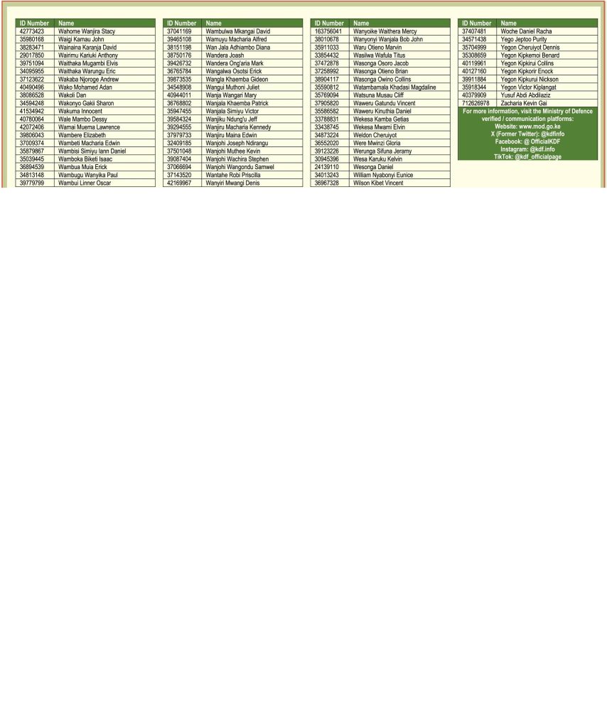 The recruitment process is free and open to all qualified Kenyans. The KDF warns that bribery or corruption of any kind during recruitment is a criminal offense. Anyone caught engaging in such acts will face prosecution. Members of the public are encouraged to report any malpractice to the nearest police station, military camp, or through hotline numbers 0726419706 or 0726419709.