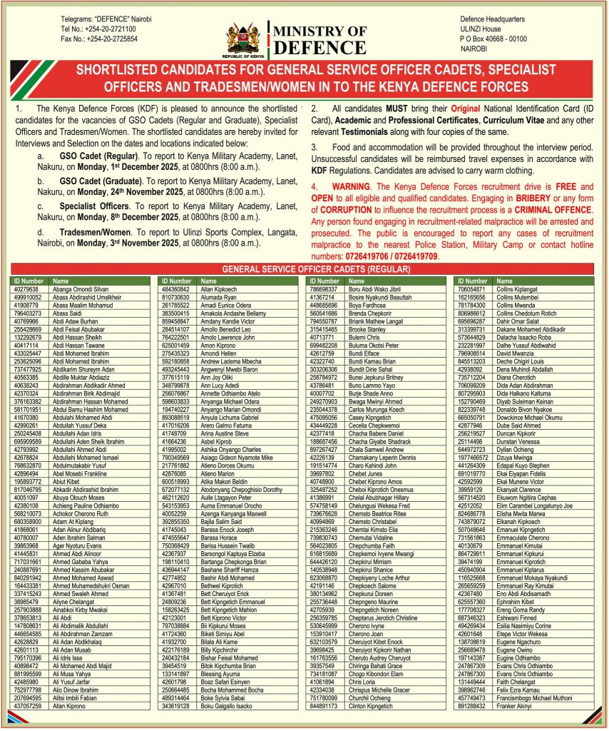 GSO Cadet (Regular): Report to Kenya Military Academy, Lanet, Nakuru, on Monday, 1 December 2025, at 8:00 a.m.